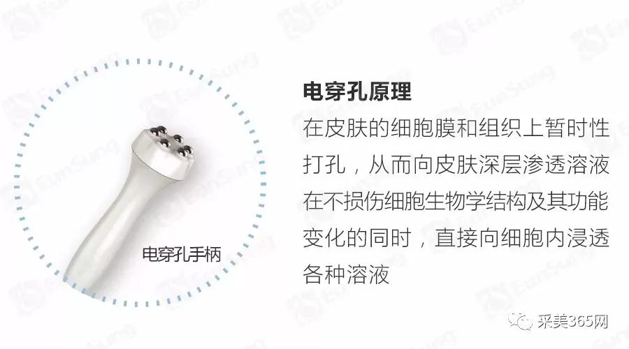 利用电穿孔的电流将皮肤细胞膜及组织进行短暂的穿孔,浸入溶液, 电穿孔在不损伤细胞功能及构造的同时, 将各种溶液直接浸透到细胞内。