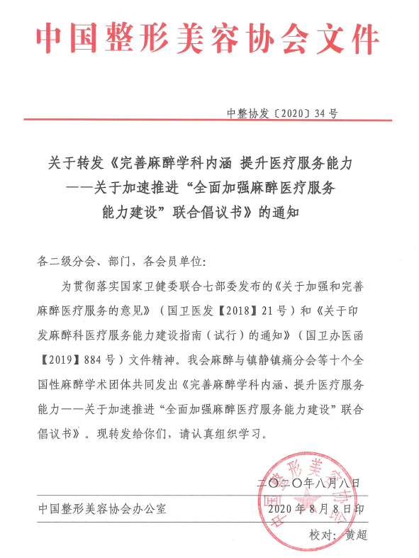 8月8日,中国整形美容协会麻醉与镇静镇痛分会等10个全国性麻醉学术团体共同发出《完善麻醉学科内涵、提升医疗服务能力——关于加速推进“全面加强麻醉医疗服务能力建设”联合倡议书》(以下简称《倡议书》)。中国整形美容协会将《倡议书》转发给各二级分会、部门和各会员单位,要求进行组织学习。