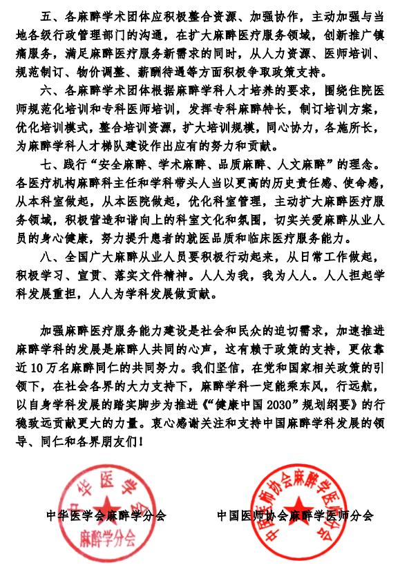 《倡议书》提出,各麻醉学术团体应积极整合资源、加强协作,主动加强与当地各级行政管理部门的沟通,在扩大麻醉医疗服务领域,创新推广镇痛服务,满足麻醉医疗服务新需求的同时,从人力资源、医师培训、 规范制订、物价调整、薪酬待遇等方面积极争取政策支持。