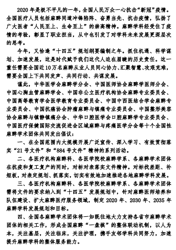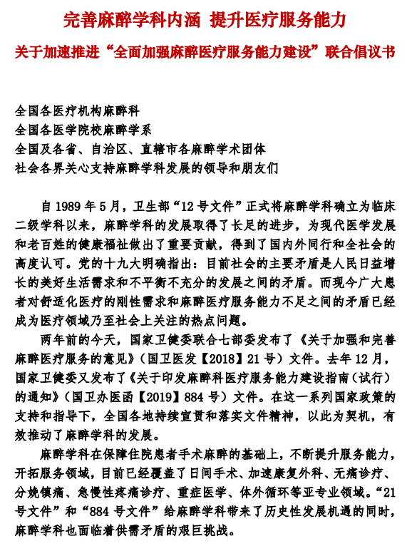 《倡议书》还提出,各麻醉学术团体根据麻醉学科人才培养的要求,围绕住院医师规范化培训和专科医师培训,发挥专科麻醉特长,制订培训方案,优化培训模式,整合培训资源,扩大培训规模,同心协力,各施所长,为麻醉学科人才梯队建设作出应有的努力和贡献。
