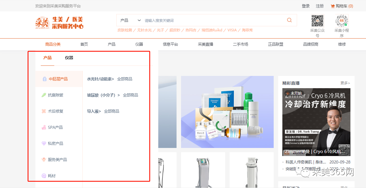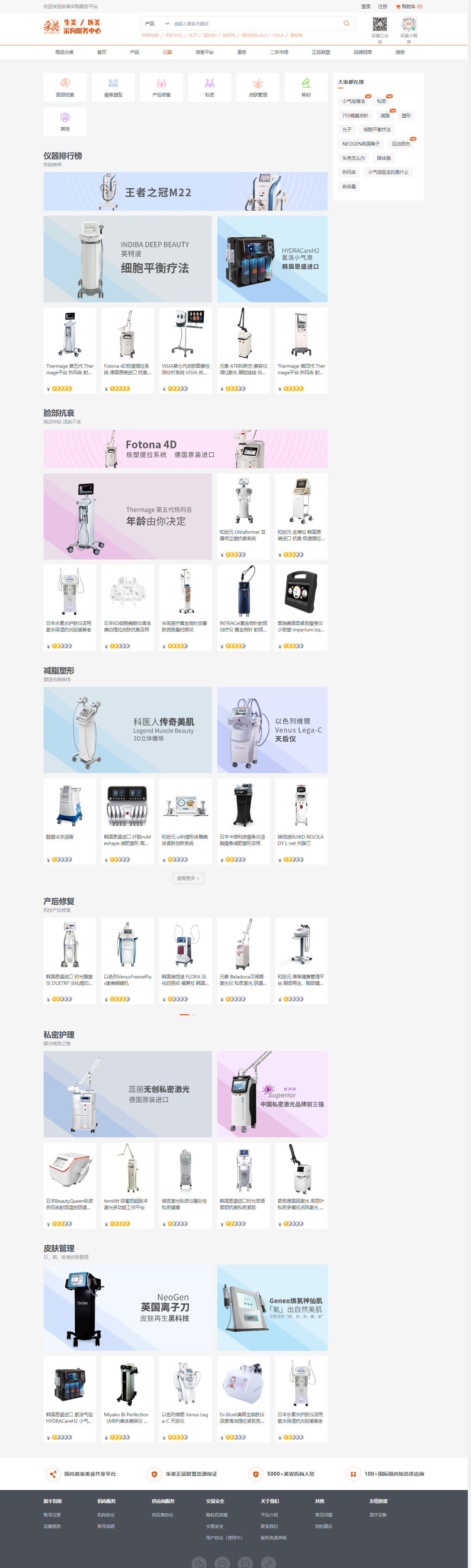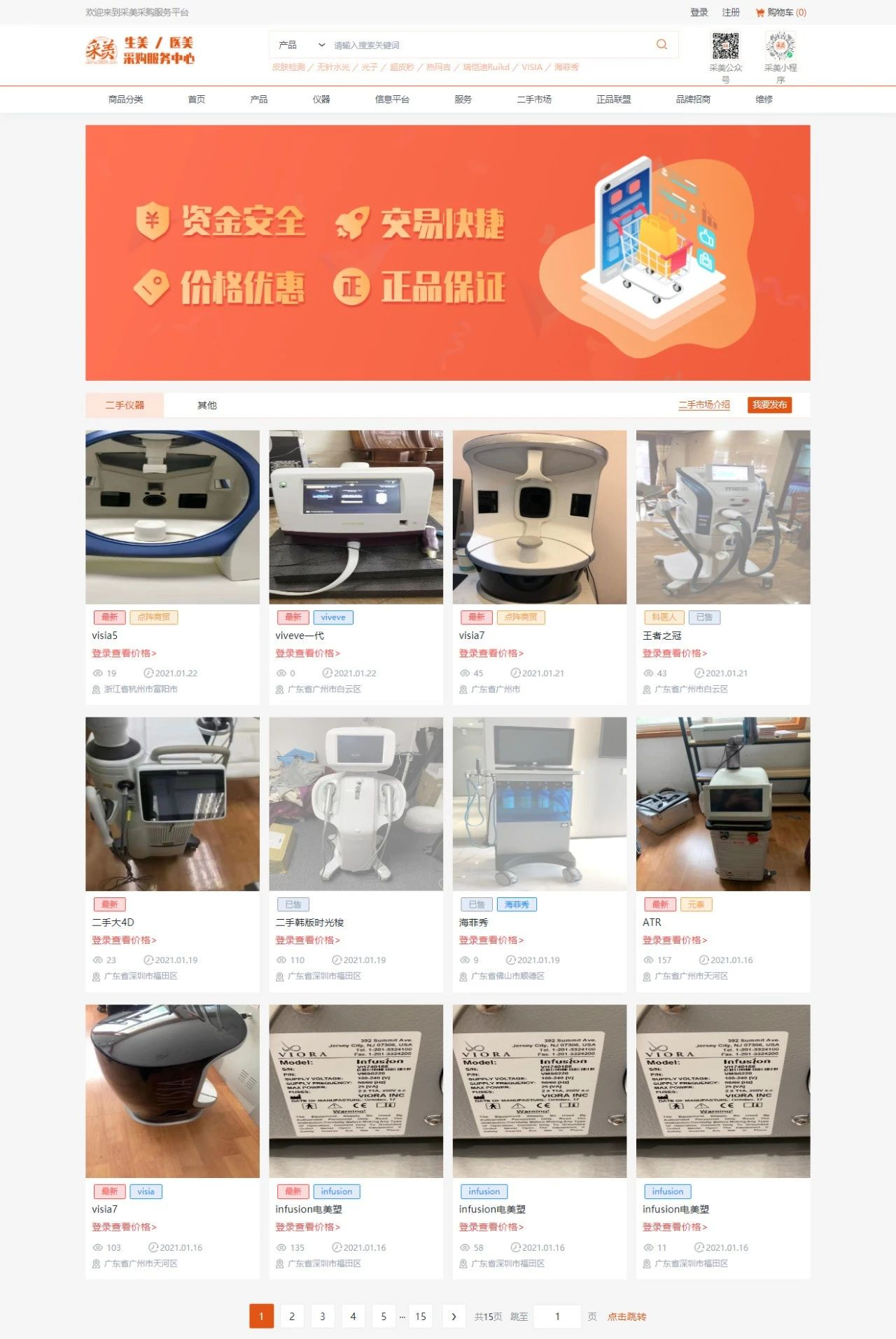 官方网站是用户对企业的第一印象,采美非常注重对官网的优化和迭代。随着平台上的品类越来越丰富,业务越来越多元化,采美官网紧跟互联网平台发展趋势,以分频道,模块化,多界面展示平台内容。目前频道有:产品、仪器、二手市场、信息中心、采美直播、正品联盟、品牌招商、服务等。每个独立频道都拥有自己的模块,模块当中对商品进行在此分类,用户查找更快捷,也为合作商提供更多的展示位置。
