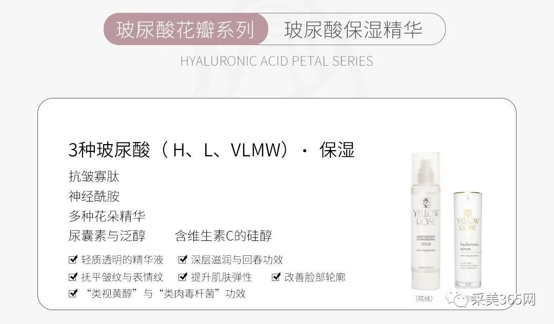玻尿酸花瓣系列产品富含玻尿酸、寡肽与多种植物花朵萃取精华,适用于所有肌肤类型,深层补水,有效持久保湿与紧致,对抗细纹,高度抗氧化保护,恢复年轻靓丽风采~
