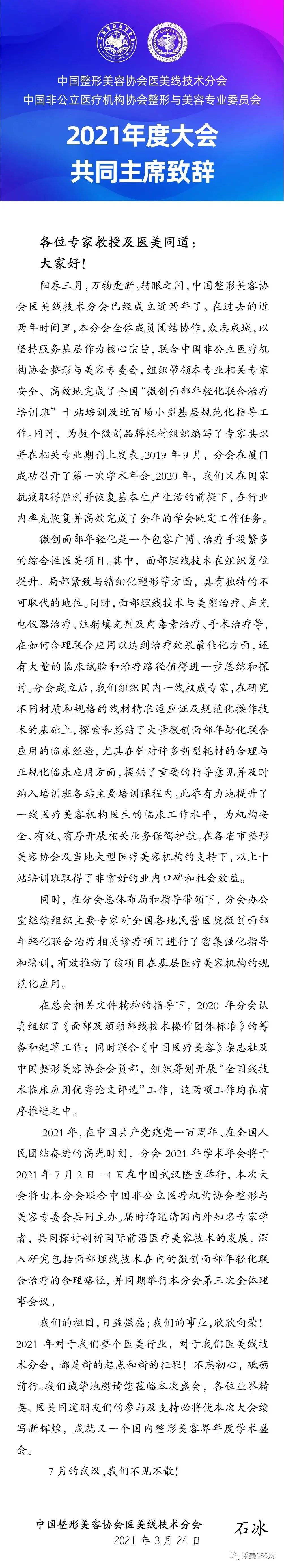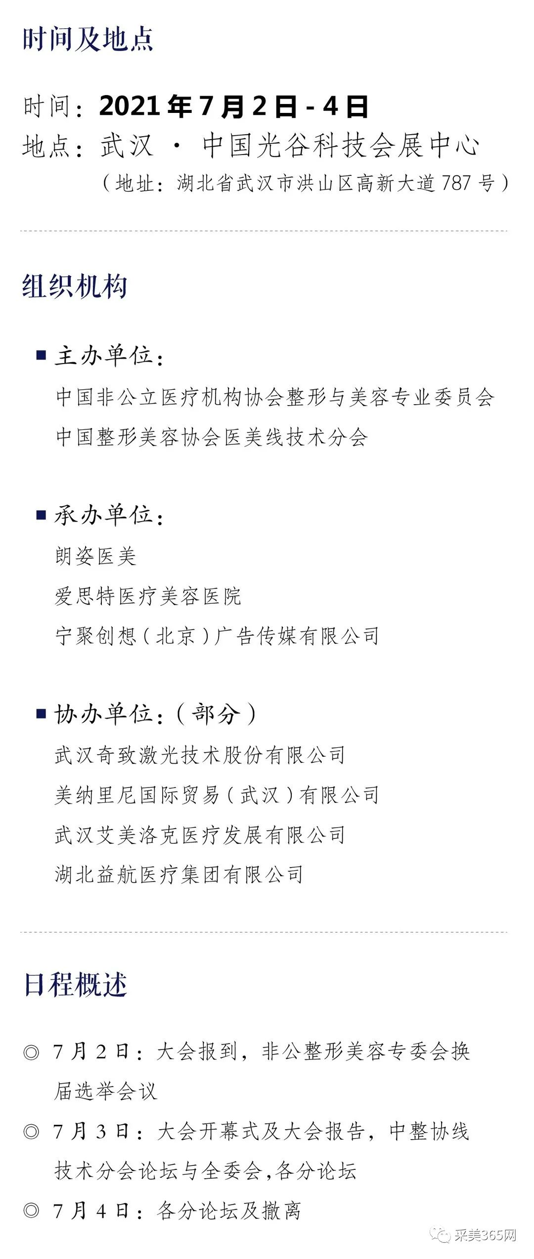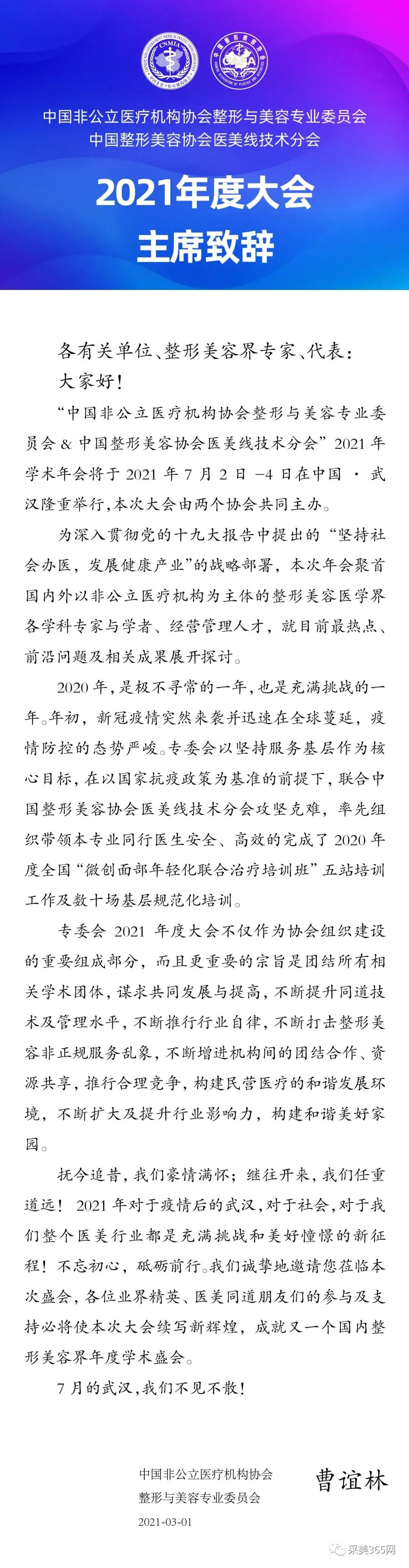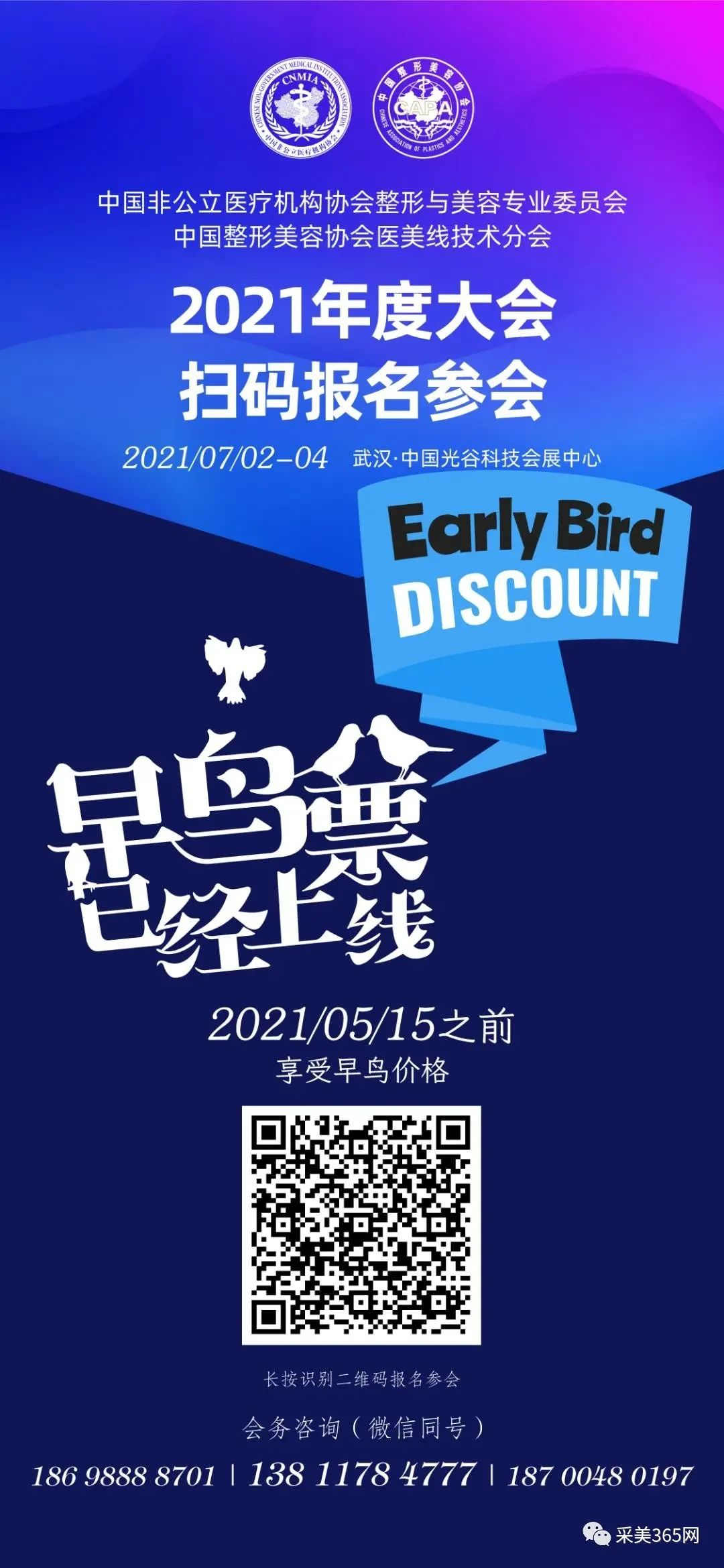 “中国非公立医疗机构协会整形与美容专业委员会 & 中国整形美容协会医美线技术分会”2021年学术年会将于2021年7月2日-4日在中国·武汉隆重举行,线上报名系统已经启动!扫描图片上方二维码,即可报名参加。