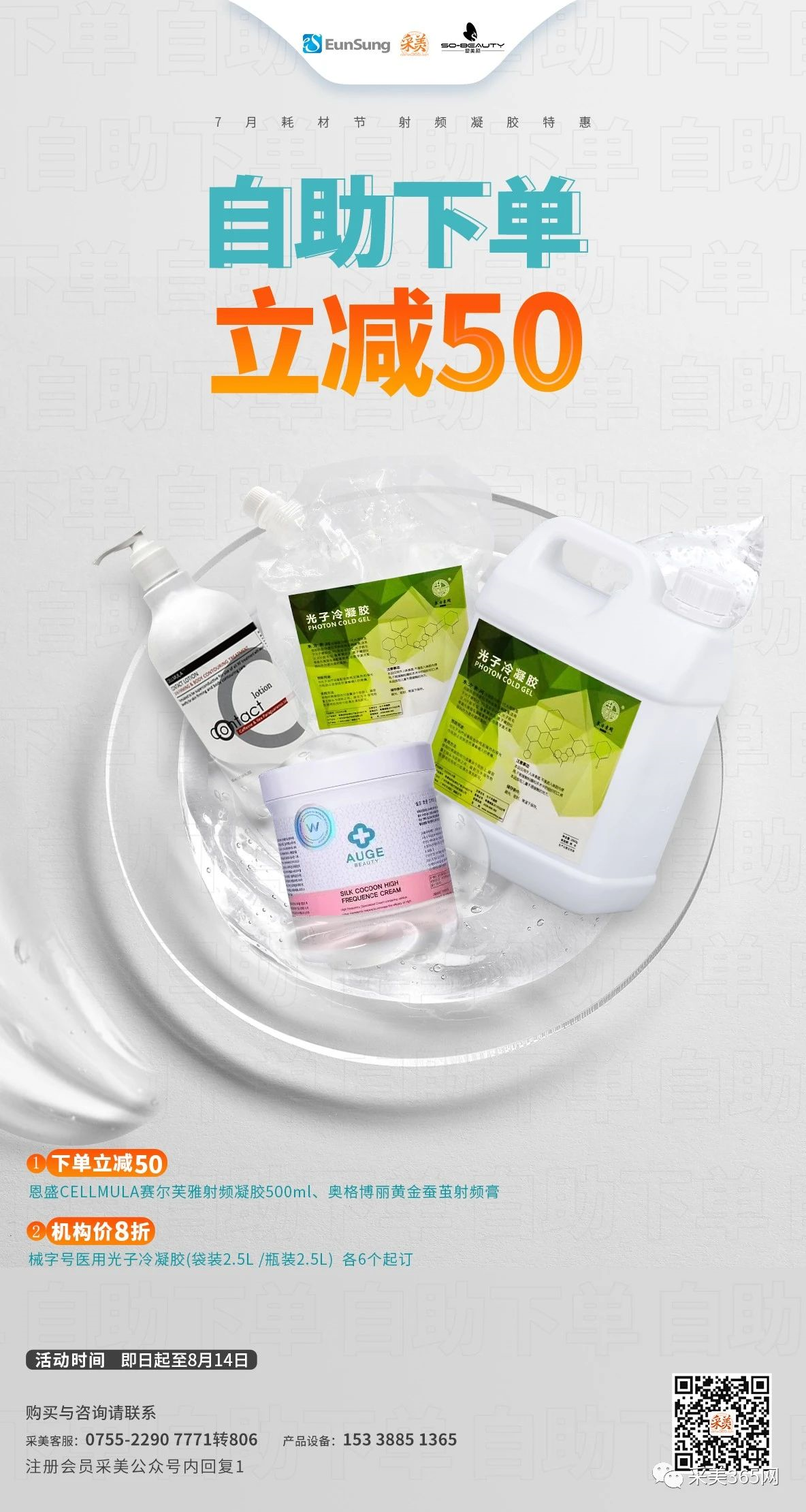 采美7月耗材节第一期活动——“射频凝胶”。即日起至8月14日,采美机构会员凡在采美采购商城自助下单购买恩盛赛尔芙雅射频专用凝胶、奥格博丽黄金蚕茧射频膏、械字号冷凝胶,均可享受活动优惠。