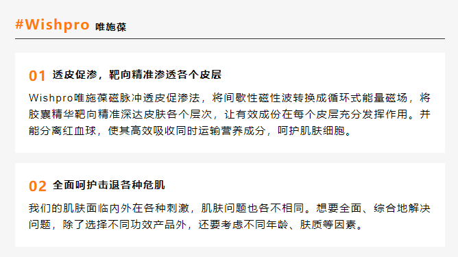 Wishpro唯施葆将“主动护肤”变为“被动干饭”,是现代都市精英人群高效、极速、科技、专业、安全护肤的优选方案。