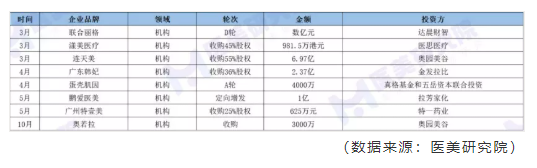 医美机构在医美行业中算是进入门槛比较低的赛道,所以也吸引了比较多没有医美根基的企业加入。今年机构相关的融资事件算不上很多,投资收购金额最高的是奥园美谷6.97亿元收购连天美55%股权,10月份又3000万收购广州奥若拉。奥园美谷半年报称,“公司通过并购医美服务机构,快速切入医美赛道。”从财报数据来看,公司上半年医美业务营收为1.56亿元,均为报告期内公司收购的浙江连天美企业管理有限公司做出的贡献。