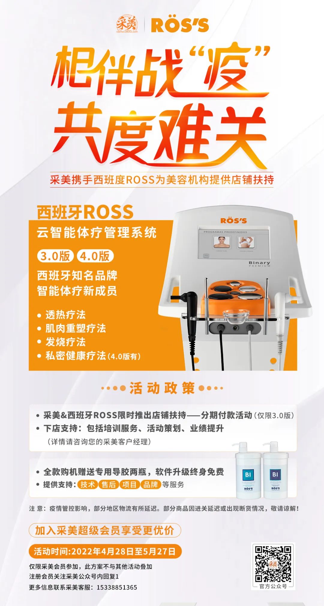即日起至2022年5月27日,采美携手西班牙知名品牌ROSS开启“相伴战“疫”,共度难关”活动月,为美容机构提供店铺扶持政策。