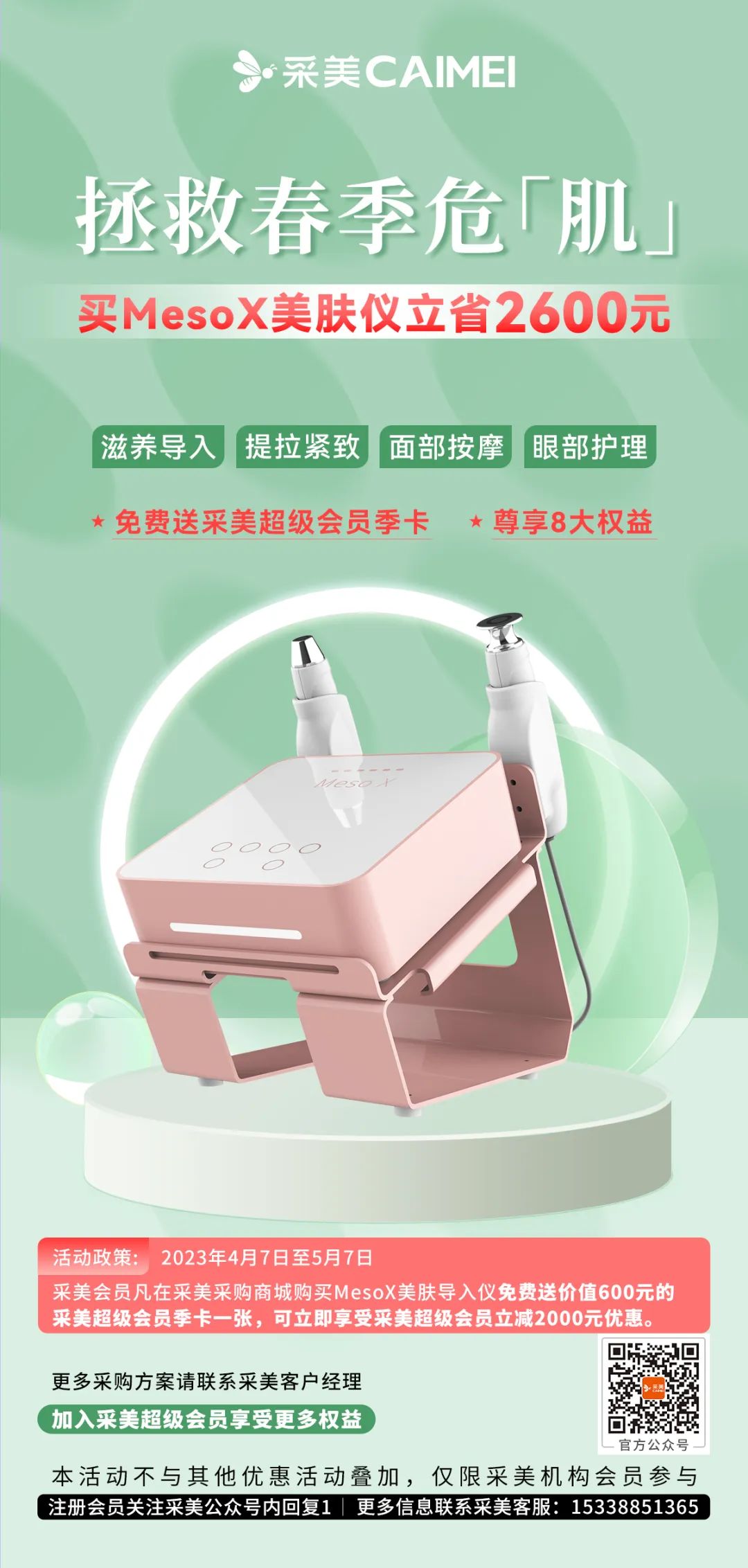 ❶ 活动期间,采美机构会员凡在采美采购商城购买Meso X 美肤导入仪免费送价值600元的采美超级会员季卡,购机当场即可享受采美超级会员立减2000元优惠。