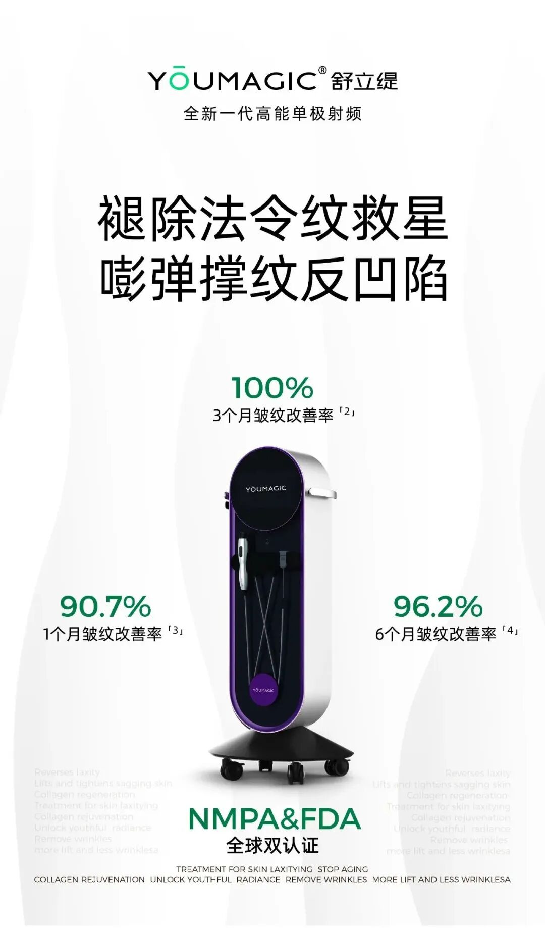 YOUMAGIC舒立缇高能单极射频皮肤治疗仪,依托清华大学近30年能量源技术积淀,拥有中国NMPA与美国FDA双认证,适用于面部松垂皱纹的非入侵性治疗,能够利用射频热效应减轻面部轻、中度皮肤皱纹,采用个性化治疗理念,拥有参数个性化调节、能量精准,效果更佳、舒适感提升等优势,其独创的“五端激活+四维验真”模式,更从源头杜绝渠道假货,解决用户痛点。