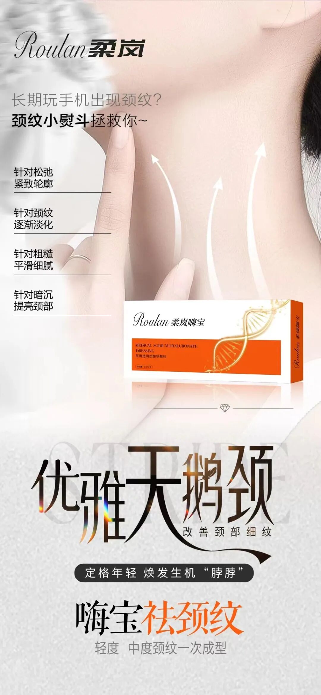 柔岚嗨宝是一款专注于颈部年轻化的专业医美产品,其通过复合营养配比使用,旨在改善多种类型的颈纹并提升颈部肌肤整体质感。该产品核心特点在于其精准针对颈部解剖特点设计,能够高效抚平皱纹、刺激胶原再生,并提供可靠的安全性保障。