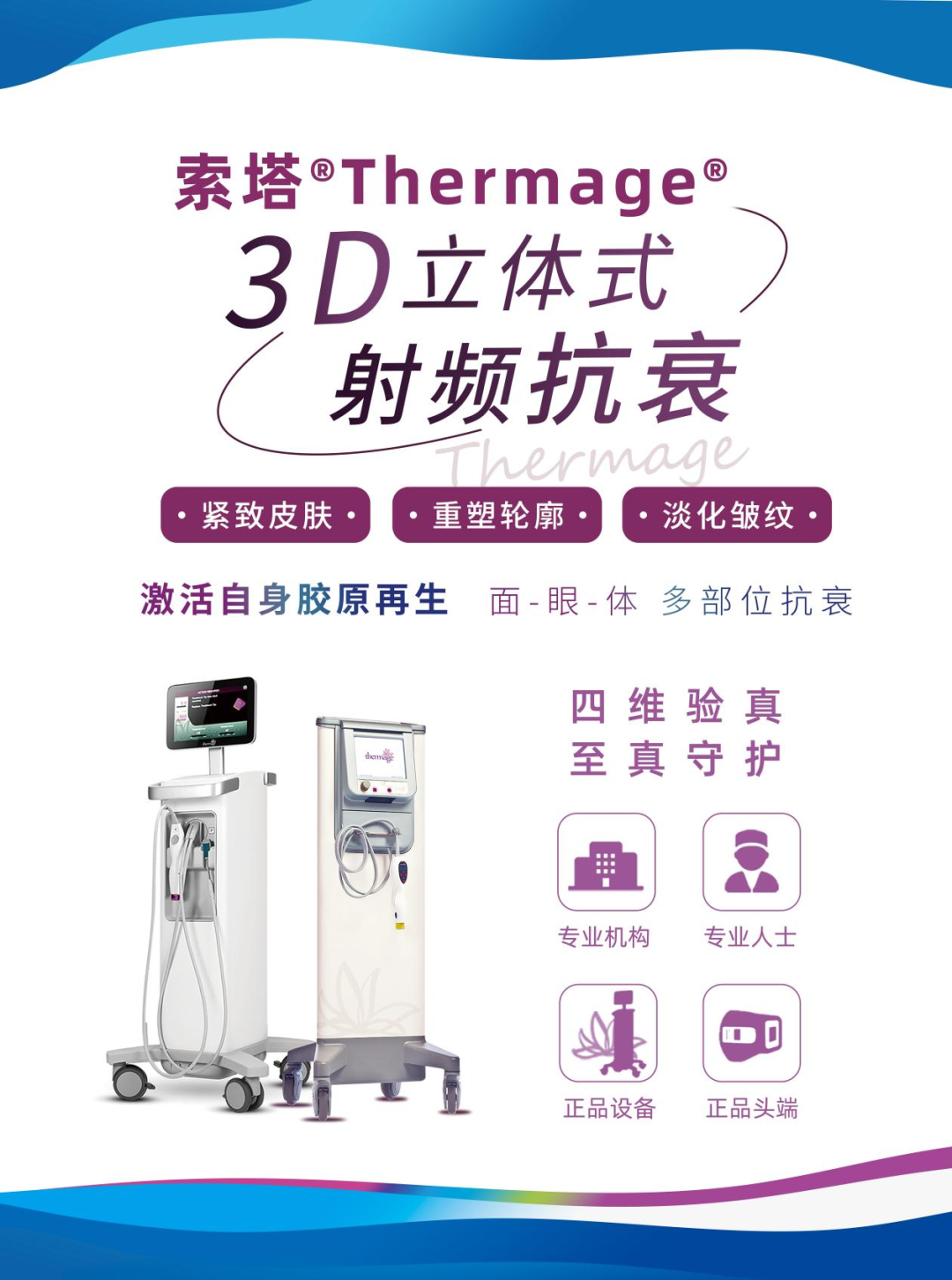 设备原理与作用:索塔®Thermage®采用射频技术作用于人体,达到胶原纤维的收缩和新生胶原纤维沉积并增加胶原纤维弹性的目的,其用于对身体、面部及眼周皱纹的非侵入性治疗,紧致松弛皮肤,减少皮肤皱纹和褶皱,改善皮肤外观。