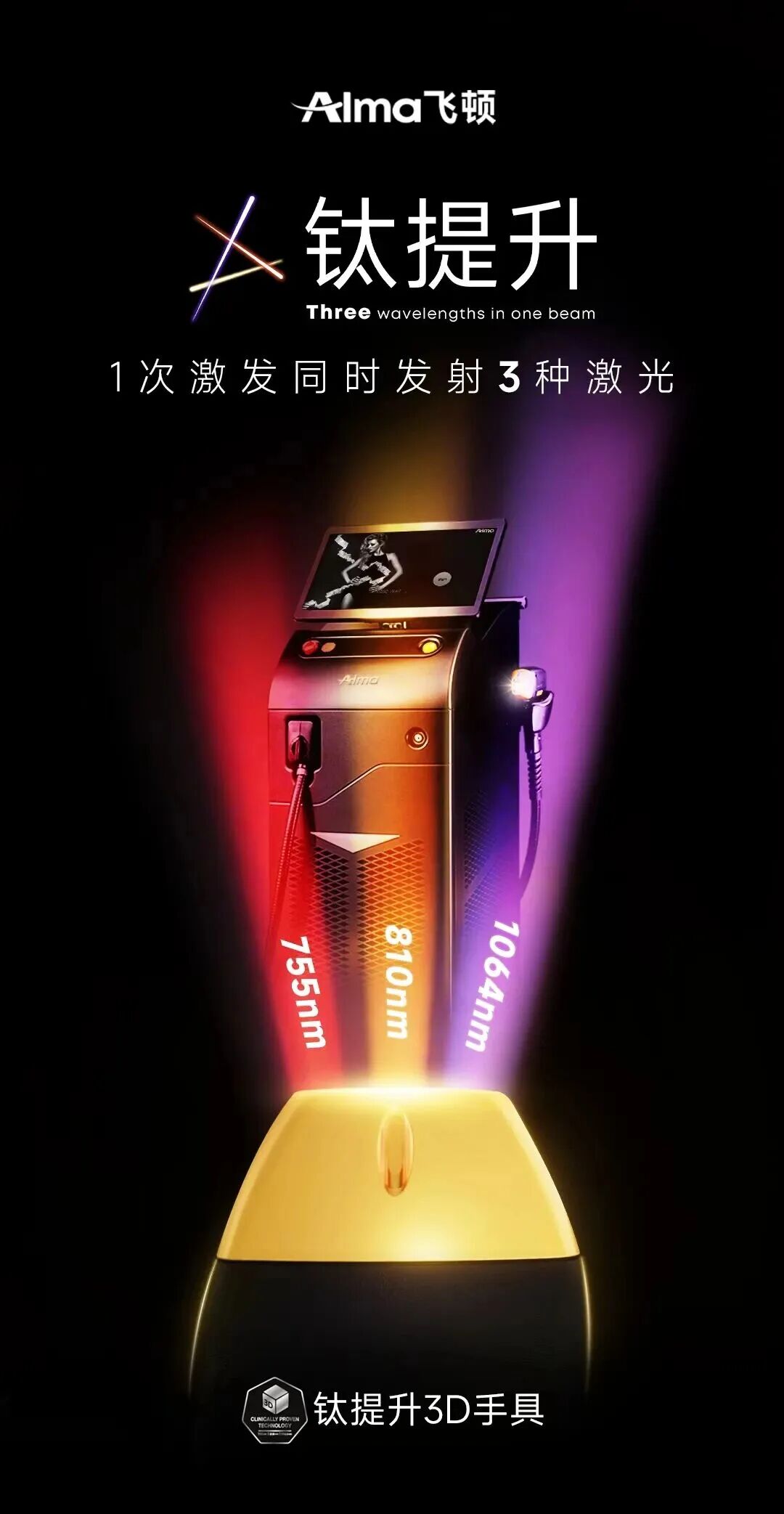 钛提升是以色列飞顿激光公司得新一代激光设备,该设备采用同源共发技术,一次激发便可同时发出755,810,1064nm三种不同波段激光,三光齐发可在皮下不同深度,不同层次形成很好得热叠加作用,进而大大提高了治疗效率。