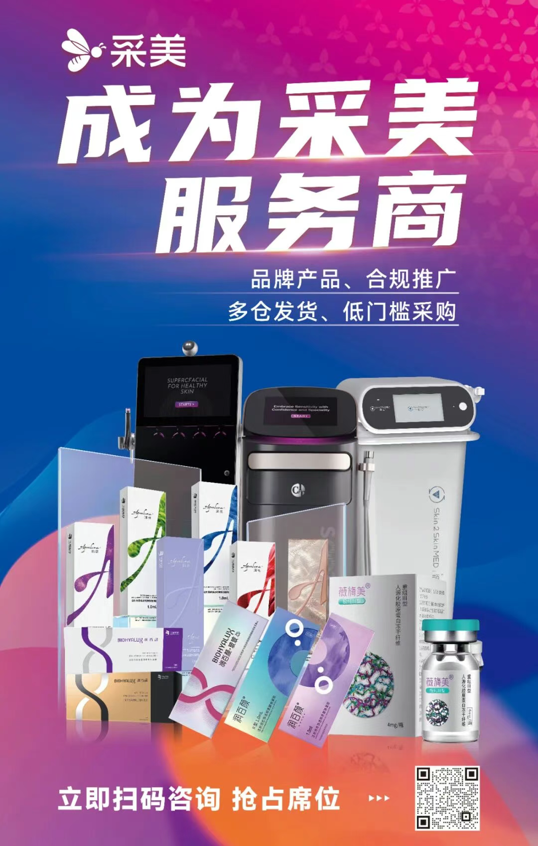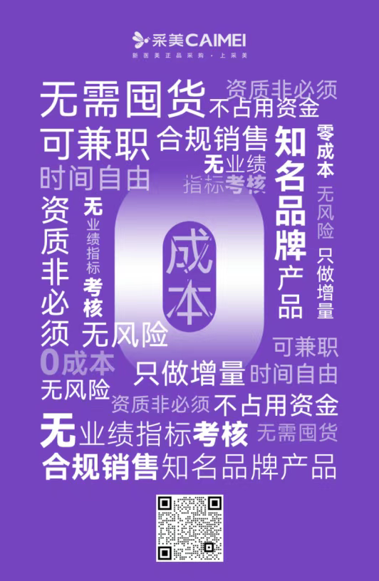 采美服务商招募旨在寻找志同道合的伙伴,构建一个灵活、高效、共赢的医美服务新生态,共同将生美/医美领域优质的产品与专业的服务送达更广阔的市场。采美全程赋予运营与系统支持,让您全身心投入到为机构客户服务中去。平台为您零成本实现业绩增长,助力您抢占蓝海市场,共同构建合规、高效、可持续的医美供应链生态。