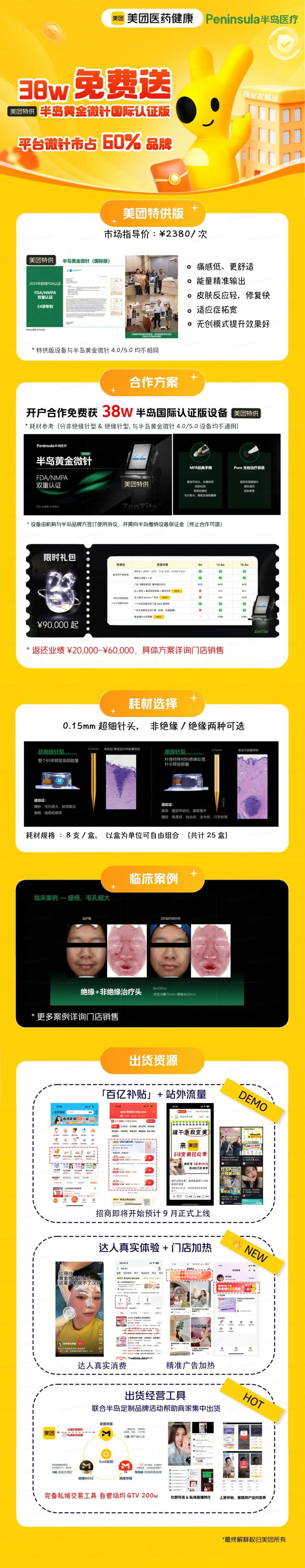 机构可免费获得市场价值约38万元的半岛黄金微针国际认证版设备,大幅降低机构在高端设备上的前期投入成本。美特供版设备项目市场指导价2380元/次。门店可选耗材有0.15超细针头,非绝缘/绝缘两种。