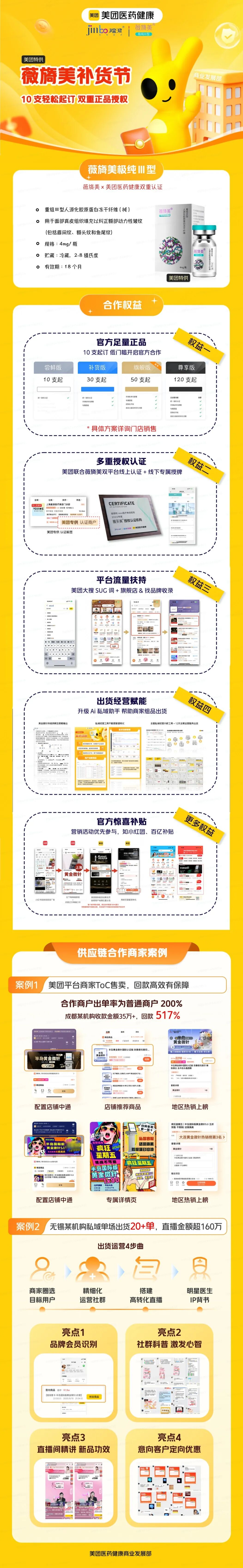 此次活动过程中,薇旖美和美团医药健康为机构保驾护航,实现双重正品认证,最大程度保障机构权益。此次发行的补货节活动,指定合作商品为薇旖美极纯III型胶原蛋白,并获得美团与品牌方的联合正品背书,增强机构与终端消费者的信任。