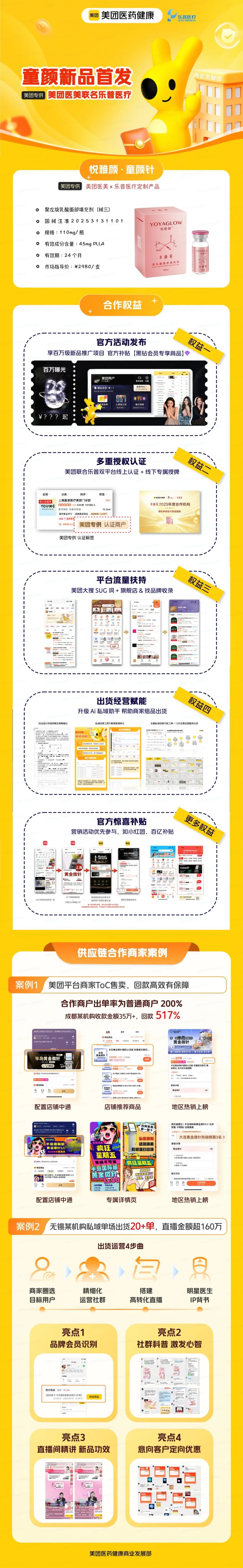 乐普医疗旗下的童颜针小颜泵联合美团首发。小颜泵是美团医美与乐普医疗联合推出的定制产品,该产品不同于另外两款,属于小剂量容量规格,满足门店的个性化需求。