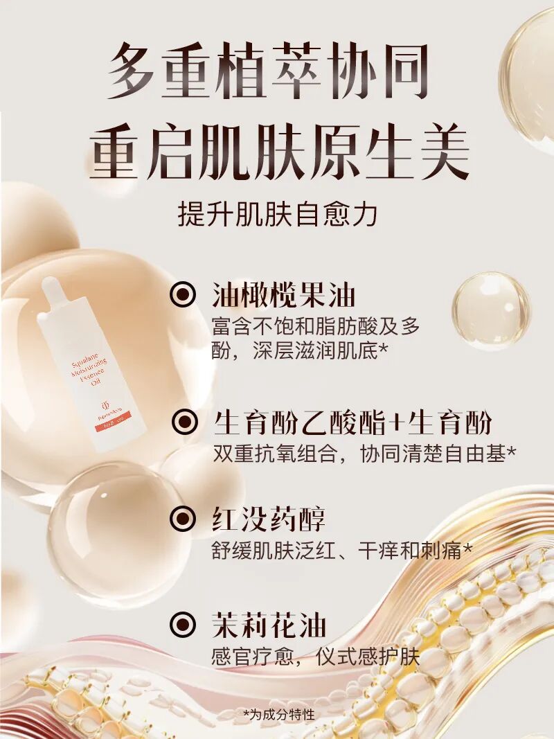 它采用纯植物来源的角鲨烷为基底,上脸清爽,没有黏腻的残留感,使用后是皮肤本身的柔滑,并没有浮在表面的油光。打破传统精华油“厚重、油腻”的刻板印象,真正实现“以油养肤不闷肤”。