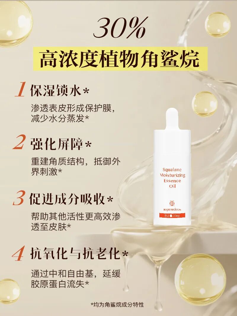 皮肤干燥、敏感的根源,大多是屏障受损导致水分锁不住。角鲨烷保湿精粹油以30%高浓度角鲨烷为核心,复配油橄榄果油,两大天然油脂强强联合,直接把“修护力”拉满。